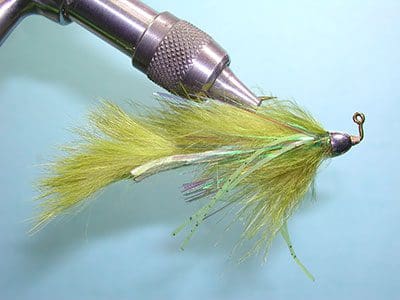 A 4 to 6 weight rod with a floating line like Rio’s Coldwater Clouser will turn over the fly well in most situations. John uses a 9′ tapered leader to 0X. Most of the takes occur when the pattern is sinking and there is no retrieve. If you have no takes on the drop, hop the fly a couple of times and let it sit. After the sit, shake the pattern and start a hopping retrieve. When the pattern sits, the eye of the hook will be towards the bottom and the Marabou and rabbit strip will undulate above it. This drives the bass nuts!