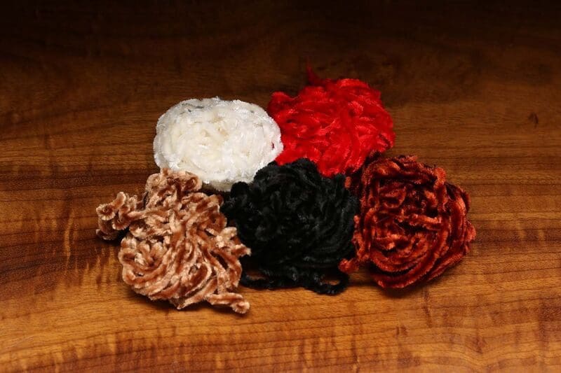 Chenille from Hareline is a popular body material is used on a wide range of fly patterns. The material is made from loose fibers spun into a thread core. It will unravel when cut. Chenille is best used for wet flies since it absorbs water.