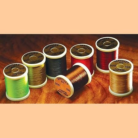 Danville 6/0 Thread lays moderately flat, is moderately strong, having a silky smooth finish and a glossy sheen. Nylon threads allow dubbing to slide more than polyester threads, like Uni Threads, and while still perfectly usable for dubbing, you should expect poorer adhesion due to a slicker thread. Denier is 70 with a .038 mm diameter and a breaking strength of 312 grams. 200 yard spools. Excellent color selection. See Color Chart.