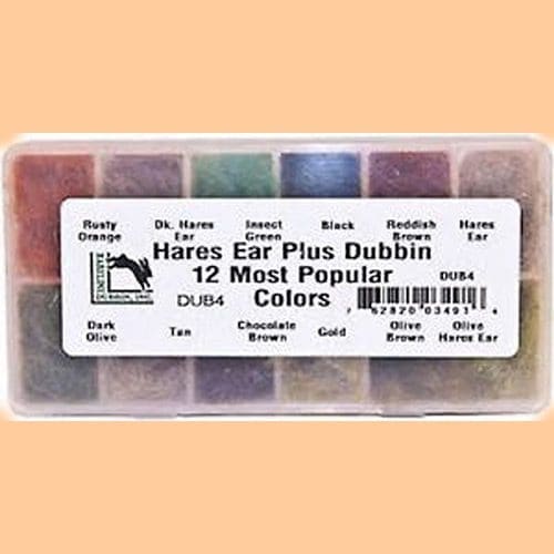 Hare’s Ear Plus Dispenser from Hareline is a mix of hare’s fur, guard hair and antron. This material is great for nymph and streamer bodies and holds bubbles well on emergers.  This dubbing dispenser has Hareline’s 12 most popular colors of Hare’s Ear Plus included in one convenient dispenser.