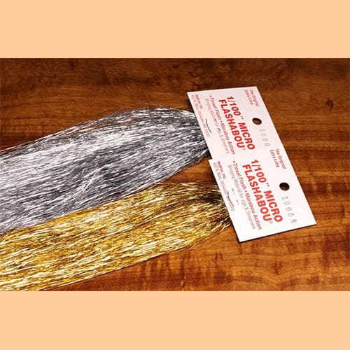 Micro 1/100″ Flashabou from Hareline is thinner than standard Flashabou, this material is wonderful when you want to add the barest hint of flash to a small streamer. A micro cut width 30% less than traditional Flashabou. Thickness has been added to each strand to provide more support and thus prevent curling. When you need a tiny rib on a nymph, try the Micro 1/100″ Flashabou. If you decide to use it as a rib on a nymph, make sure you counter rib it with tippet or a strong, translucent thread.