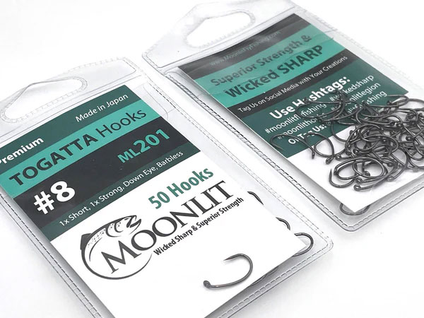 ML201 TOGATTA Barbless Hooks from Moonlit.  A premium barbless 1X Short scud style hook with down eye and 1X Strong wire. Enjoy the Highest Quality Tempering out of one of the leading Hook Manufacturing Plants in Japan.  This adds superior strength, durability, and sharpness.