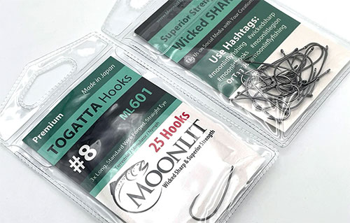 ML601 TOGATTA Barbless Hooks from Moonlit. A premium barbless Stimi/Nymph hook with Straight eye and 3X Long, and standard wire. Fantastic for tying stimulators, hoppers, terrestrials, stonefly nymphs, and other patterns that require a long slightly curved hook. Enjoy the Highest Quality Tempering out of one of the leading Hook Manufacturing Plants in Japan. This adds superior strength, durability, and sharpness.