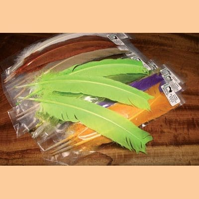 Turkey Round Wing quills are the secondary wing feathers on the bird. The secondary quills are more rounded on the tips and softer than the primary quills, known as Turkey Biot quills. Turkey Round Wing quills make great hopper wings, muddler wings, and wings for many wet fly patterns. They can also be used for wing cases on nymphs where a lighter wing case is needed.