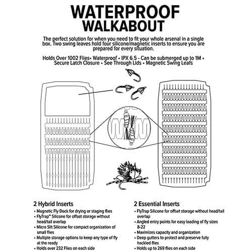 The UPG Walkabout Fly Box is the perfect solution for when you need to fit your whole arsenal in a single box. Two swing leafs hold four silicone/magnetic inserts to ensure you are prepared for every situation. The Waterproof Walkabout Fly Box allows you to organize all your flies for full days chasing hatches on the water.