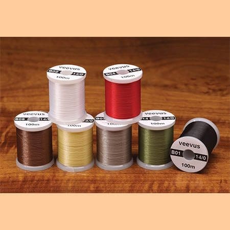 Veevus 14/0 Thread is a premium polyester thread from Veevus in Denmark. It is 2x stronger than many other comparable threads and will not result in excessive build-up. We carry four thicknesses: 10/0, 12/0, 14/0, and 16/0. The thread is a spun thread that lays flat and is very split able. Veevus 12/0 and Veevus 14/0 Thread are both rated at 70 denier. 100 meters per spool. See color chart.