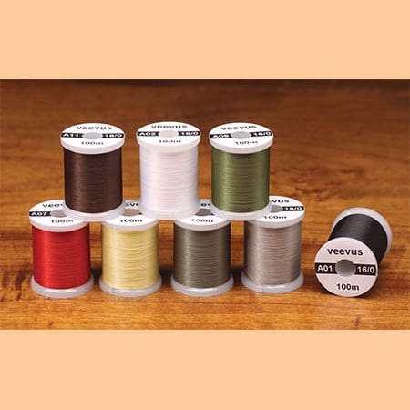 Veevus 16/0 Thread is a premium polyester thread from Veevus in Denmark. It is 2x stronger than many other comparable threads and will not result in excessive build-up. We carry four thicknesses: 10/0, 12/0, 14/0, and 16/0. The thread is a spun thread that lays flat and is very splitable. Veevus 16/0 is rated as a 50 denier thread. 100 meters per spool. See color chart.